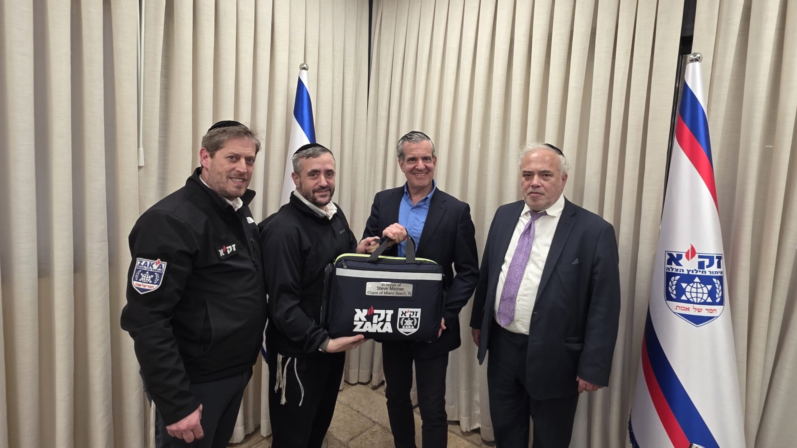 בביקור העניק ראש העיר מיינר תיק ציוד רפואי ומבצעי מתקדם למתנדב שמחה גריינמן סר"צ זק"א במודיעין עילית ומתנדב ביחידה הבינלאומית של זק"א. התיק נתרם על ידי ידיד הארגון ותושב מיאמי, מר לארי בוקמן, אשר ביקש להקדיש את התרומה להצלחתו ולזכותו של ראש העיר.