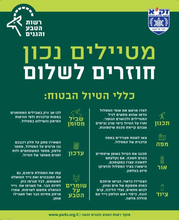 בזק״א וברשות הטבע והגנים קוראים לציבור לגלות אחריות, להיערך נכון לפני כל יציאה לשטח וכך נוכל לחזור הביתה בשלום.