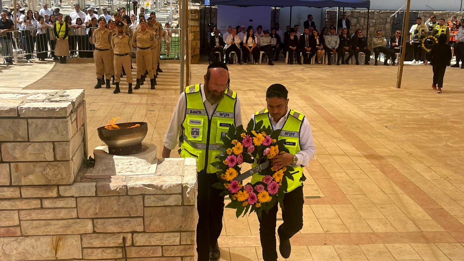 יואל ענקי וצבי פרוכטר, מתנדבי זק"א מרחב לכיש – צוות קריית גת, מניחים זר בטקס הזיכרון המרכזי של צה"ל שנערך בבית העלמין בקריית גת.