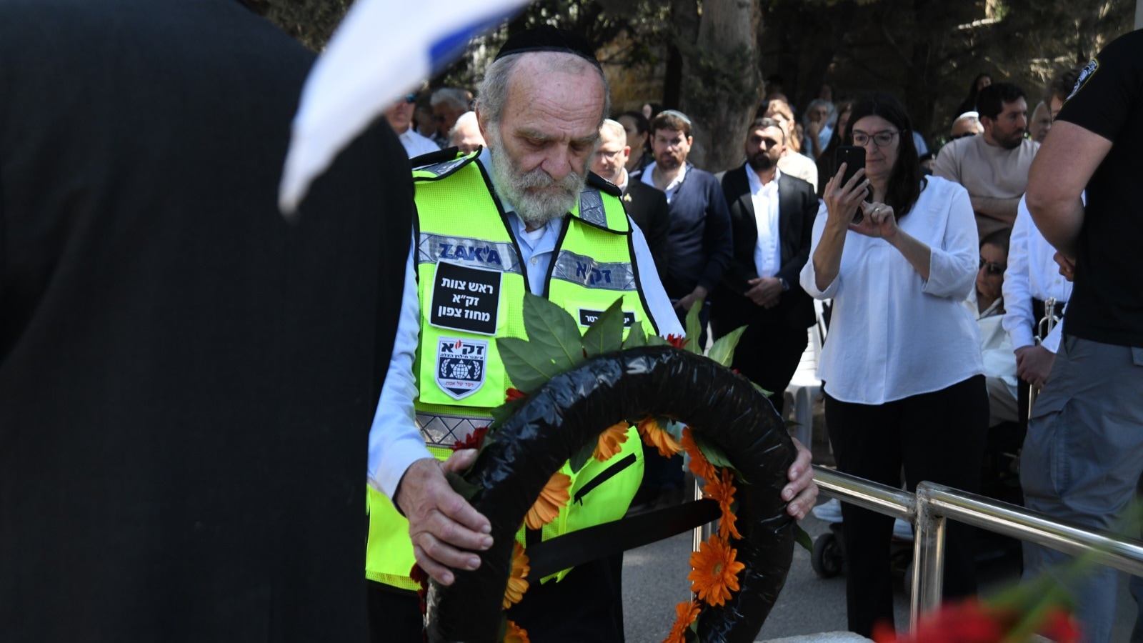 ישראל שכטר ראש צוות זק"א במחוז צפון, מניח זר בטקס הזיכרון העירוני שנערך בבית העלמין בחיפה.