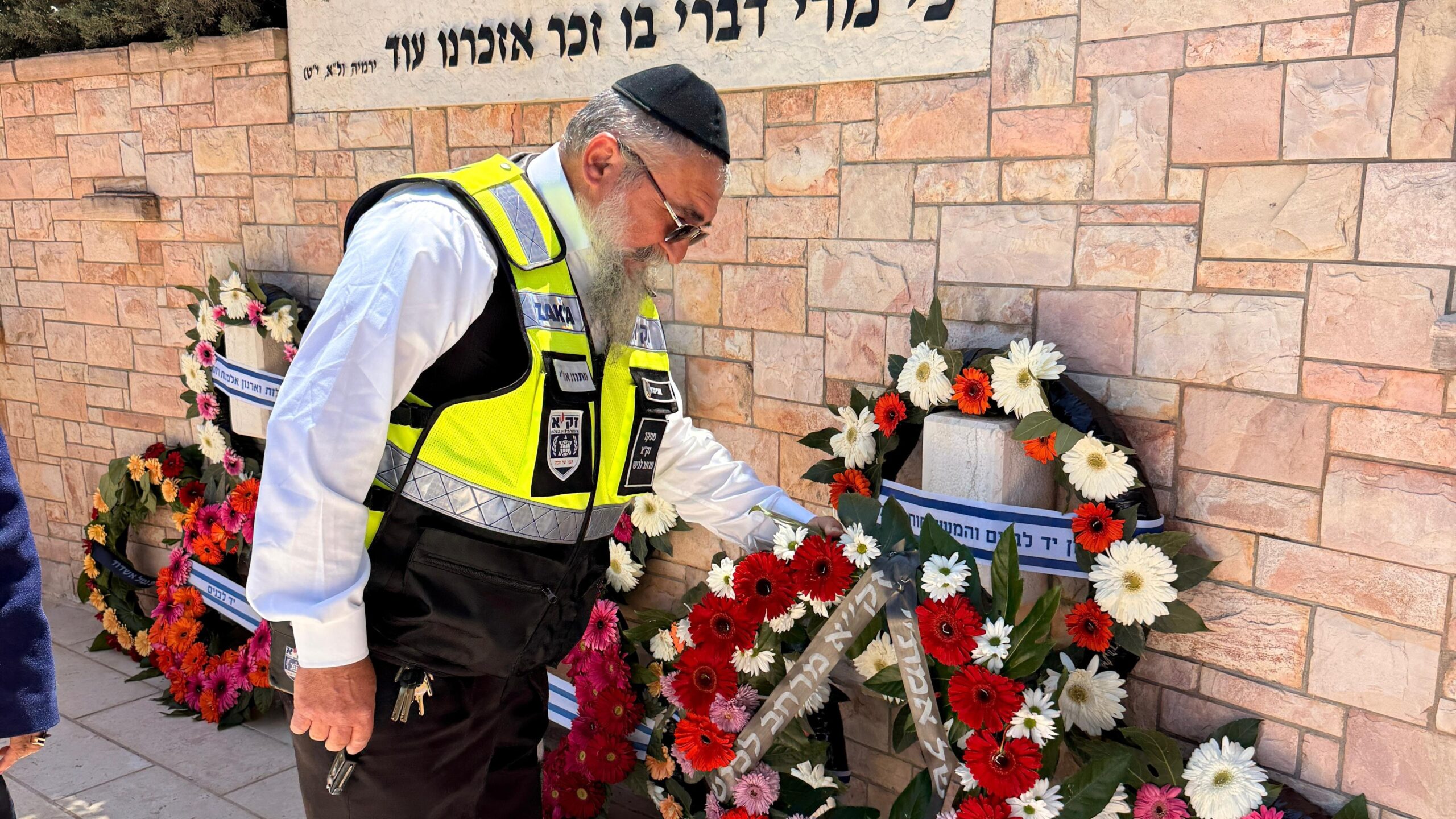בנצי לייזרוביץ, מתנדב זק"א מחוז ירושלים – צוות גבעת זאב, מניח זר בטקס הזיכרון העירוני שנערך בגבעת זאב.